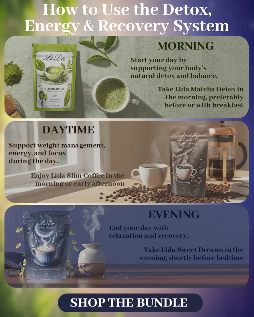 Lida Matcha Detox is a premium matcha-based formula designed to support the body’s natural detox processes and internal balance. Made with high-quality matcha green tea and carefully selected plant ingredients, it provides antioxidant support and helps promote a refreshed, lighter feeling.