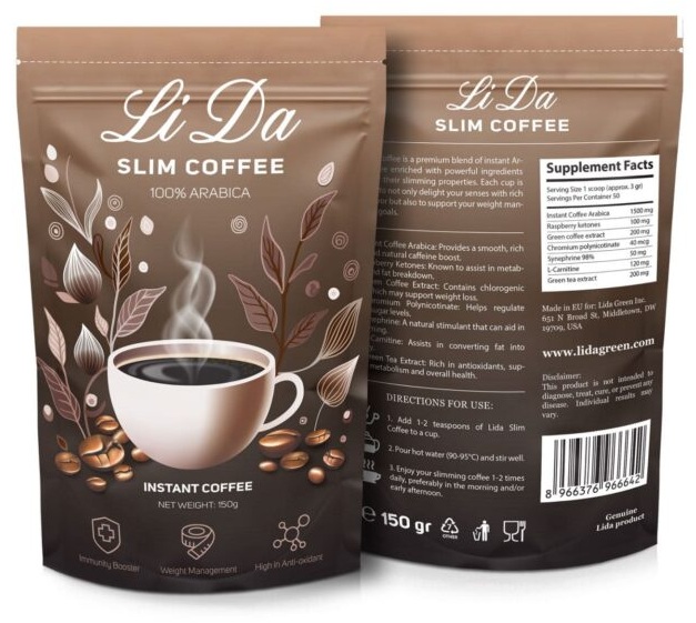Lida Slim Coffee is an instant coffee blend that combines Arabica coffee with active ingredients aimed at supporting metabolism and weight management.